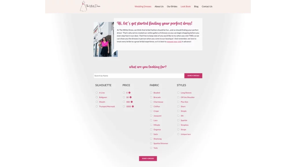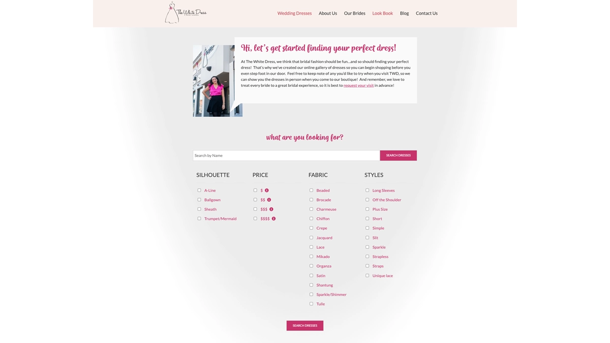 The White Dress’s wedding dress gallery gives brides a clear, browsable catalog of gowns, complete with filters by silhouette, price, fabric, and style. I built this so users can narrow down dresses that fit their taste and budget, then click through to view full details.