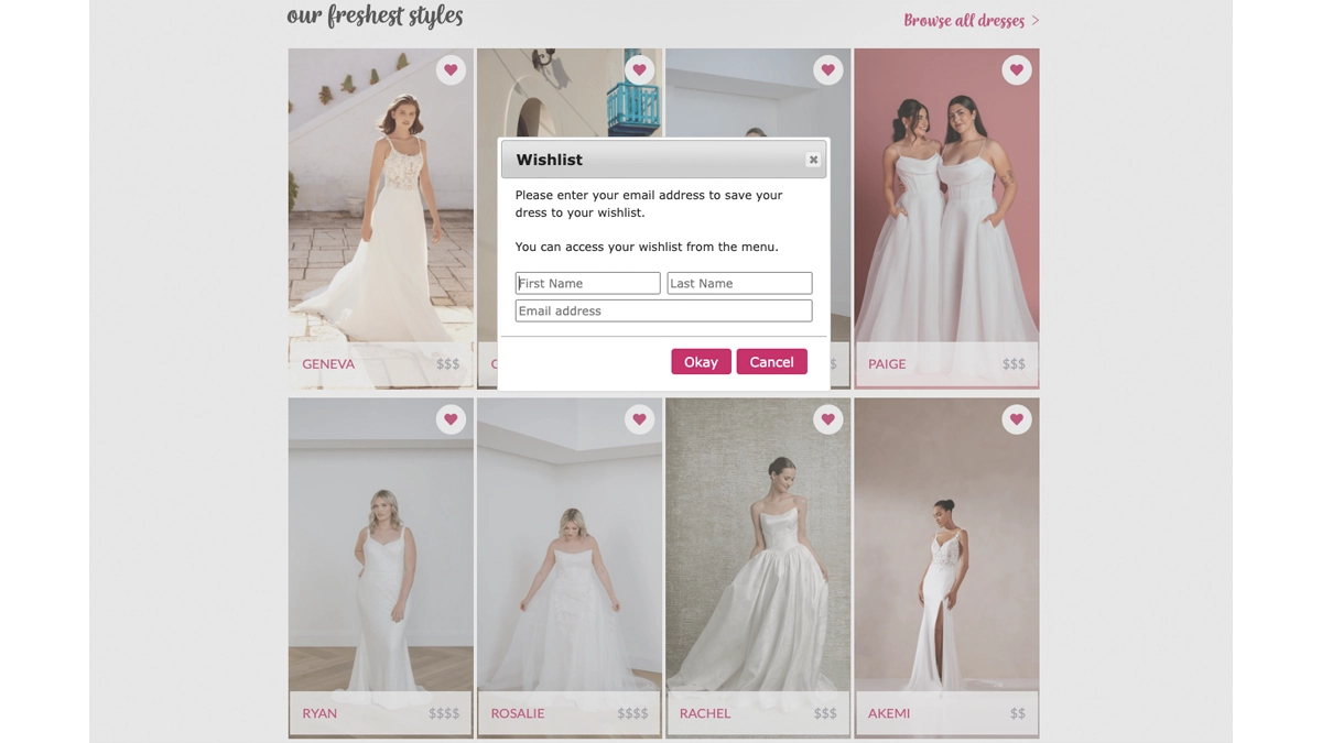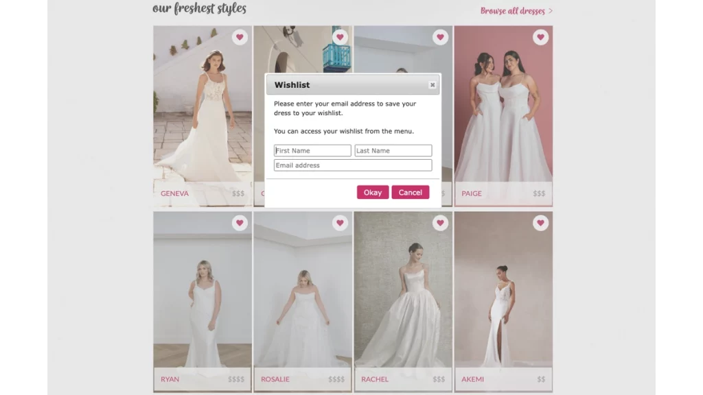The Wishlist feature lets brides save favorites using their email. They can return later and review their chosen gowns in one place. I tied the wishlist directly into the product listings, so it feels seamless with the rest of the browsing experience.