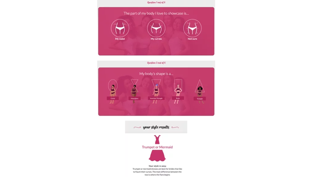 The Silhouette Quiz helps users discover flattering dress silhouettes based on a few questions. I implemented the quiz logic so answers map to recommended styles, and linked the suggestions back into the gallery so brides see dresses tailored to their profile.