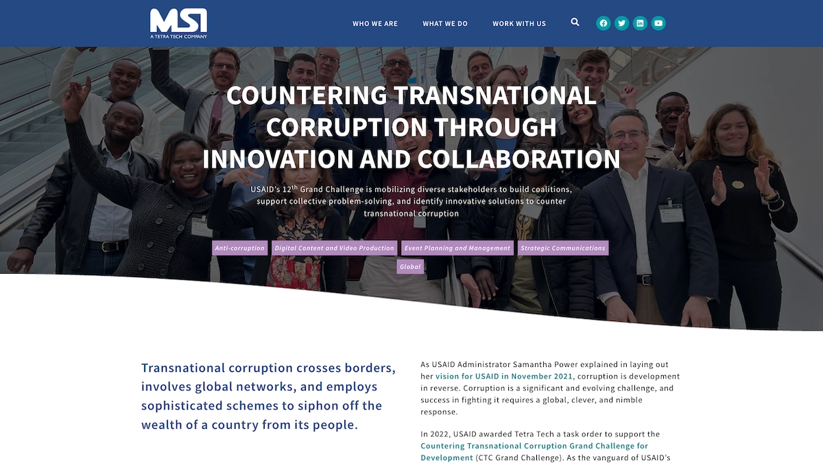 Contracted by Management Systems International (MSI), I developed the Countering Transnational Corruption Grand Challenge (CTC) WordPress site. It was designed as a comprehensive hub to communicate the initiative’s goals, showcase activities, and provide resources to a global community of stakeholders.
